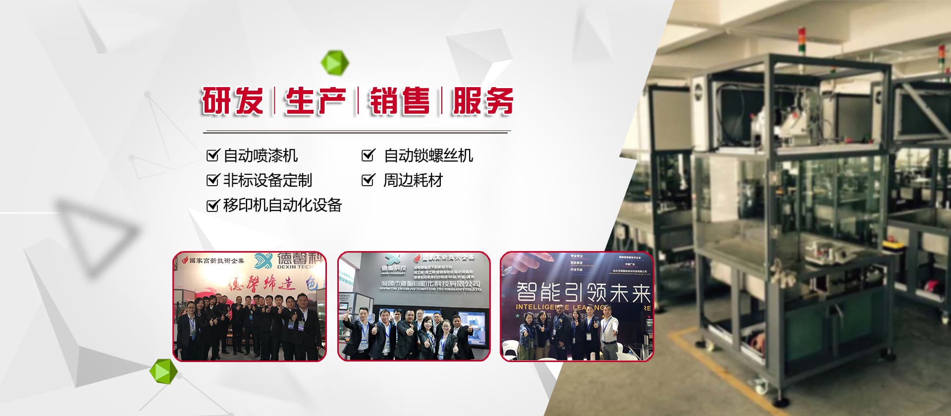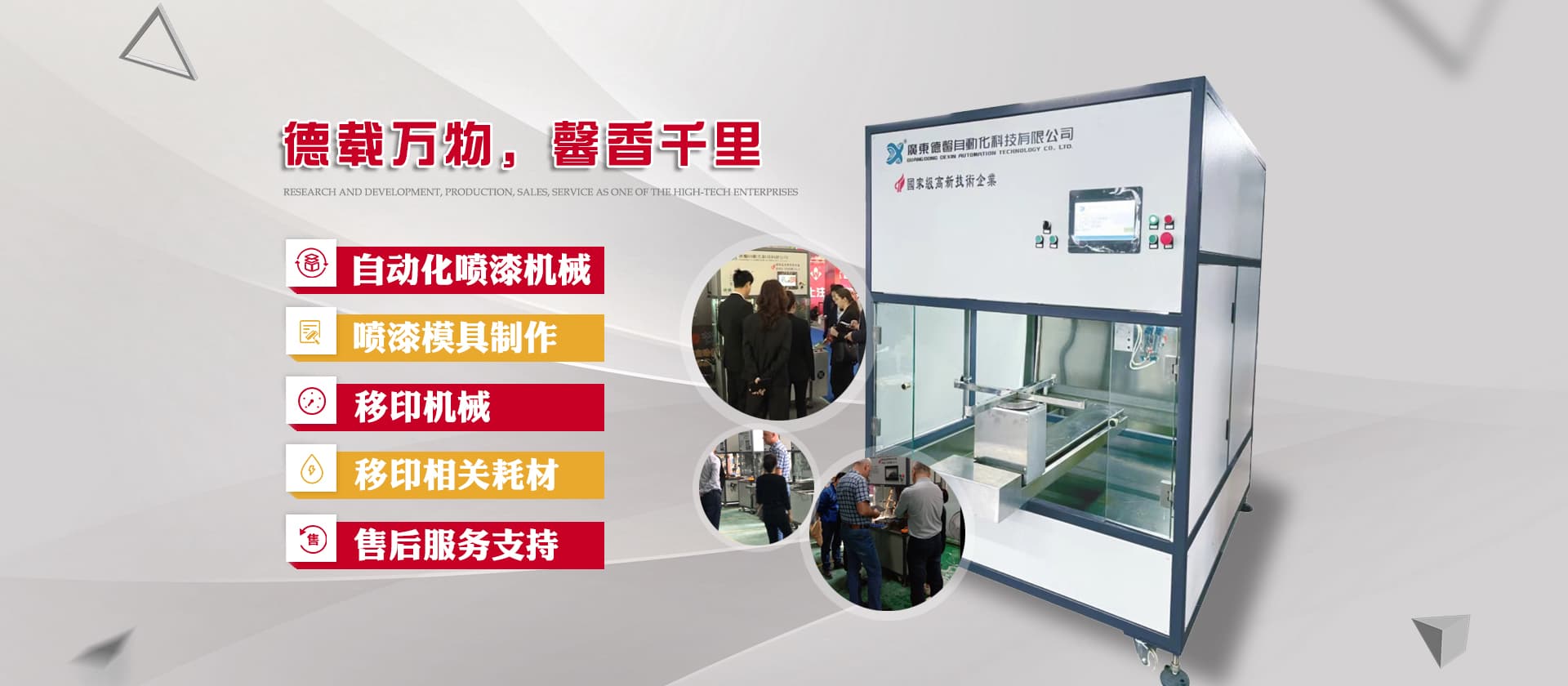 德馨科技創(chuàng)立以來(lái),以改變噴印業(yè)傳統(tǒng)手工生產(chǎn)模式為目標(biāo),產(chǎn)品開(kāi)發(fā)制造堅(jiān)持以“環(huán)保、智能”為理念,為企業(yè)的生產(chǎn)環(huán)境、人力成本、生產(chǎn)效率等提供更為優(yōu)良的服務(wù)和技術(shù)支持。公司研發(fā)產(chǎn)品主要有自動(dòng)化噴漆機(jī)械、噴漆模具制作等;生產(chǎn)銷售移印機(jī)械及移印相關(guān)耗材,包括菲林設(shè)計(jì)輸出;鋼板制作、移印膠頭制作、定位制作及周邊配件耗材并提供完善的售后服務(wù)支持。
